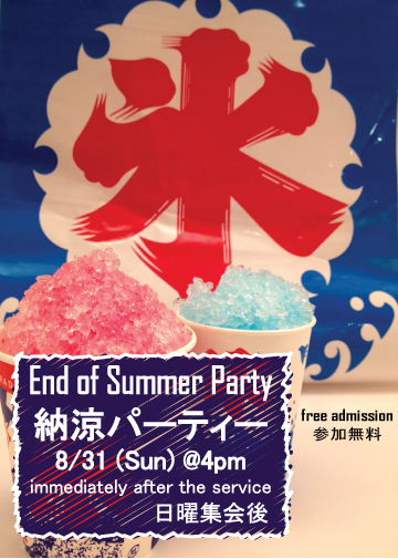 納涼パーティ End of Summer Party snow cones, ice cream, yo-yo fishing, water melon, & food カキ氷、アイスクリーム、ヨーヨーつり、すいか、食べ物 Share this: Click to share on X (Opens in new window) X Click to share on Facebook (Opens in new window) Facebook Like Loading... Related