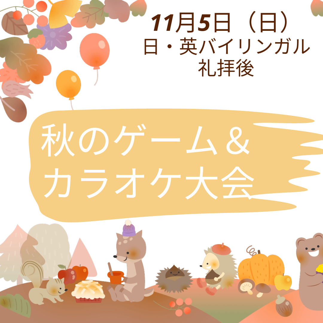 - 礼拝後:秋のゲーム・カラオケ大会 @Fellowship Hall: カードゲーム、ボードゲーム、カラオケ、教会提供の食事 (Seiwaからのカレーライス、サラダ)